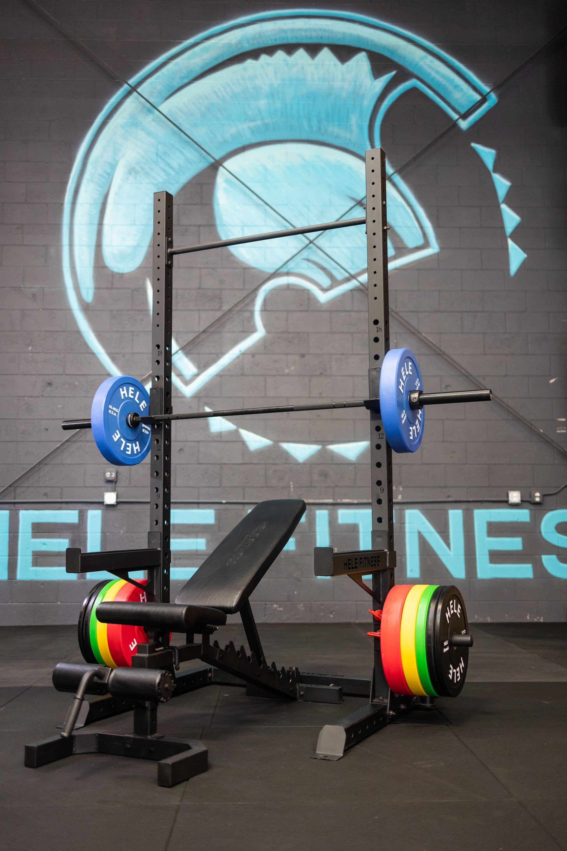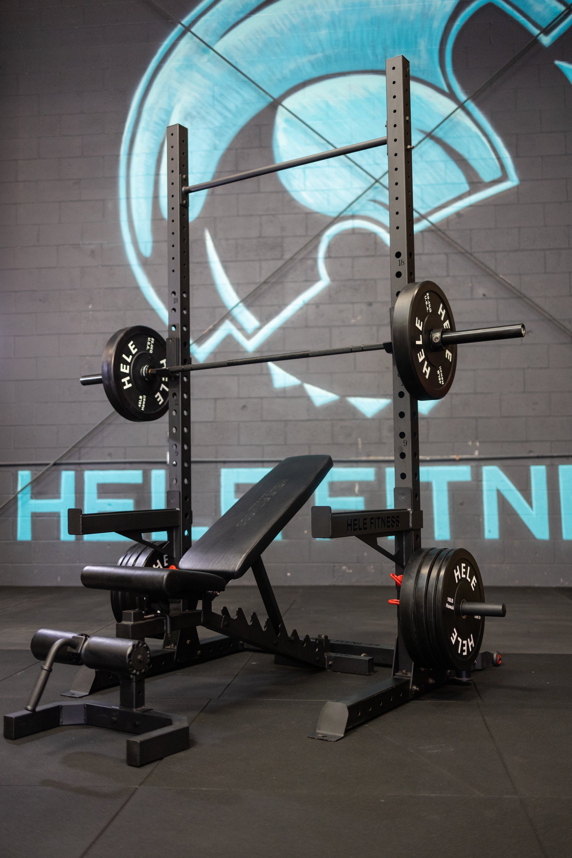 The New Hele Power Squat Rack is a beast, it is built with 3x3 inch reinforced 11 gauge steel and triangle base plates for maximum stability. We designed this rack with the garage gym in mind, so we dialed the footprint down to just over 17sq. ft. making this the perfect foundation of any home/garage gym. Â