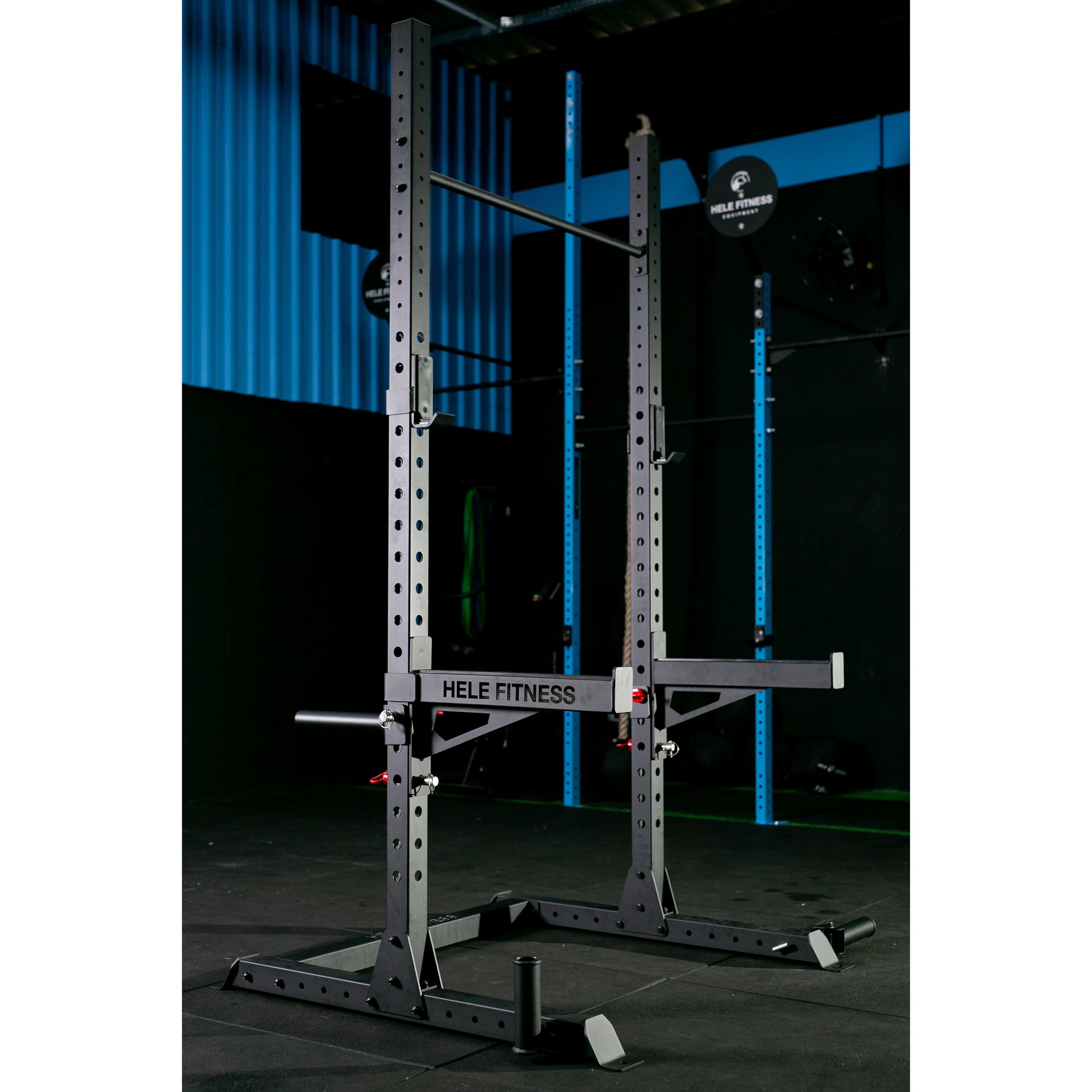 The New Hele Power Squat Rack is a beast, it is built with 3x3 inch reinforced 11 gauge steel and triangle base plates for maximum stability. We designed this rack with the garage gym in mind, so we dialed the footprint down to just over 17sq. ft. making this the perfect foundation of any home/garage gym. Â