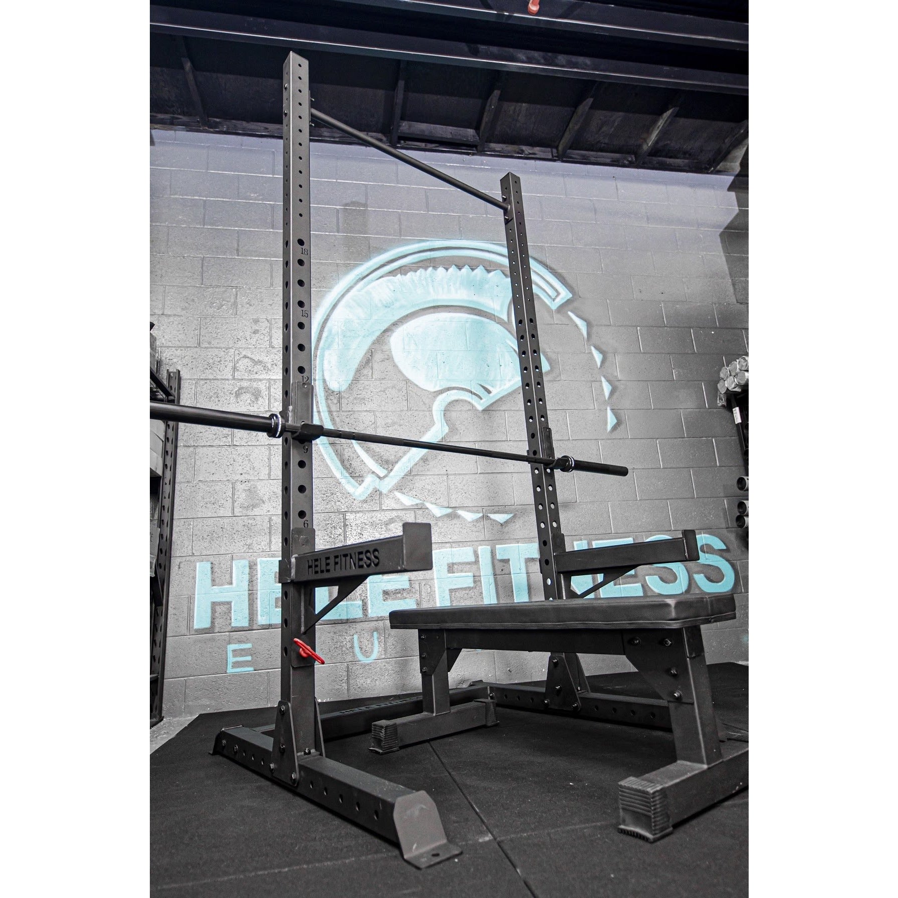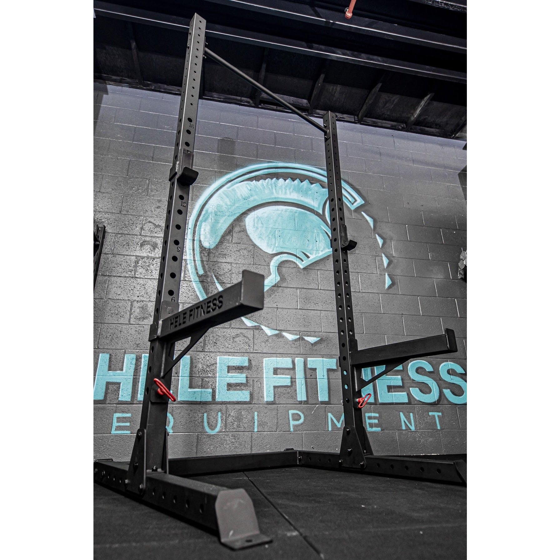 The New Hele Power Squat Rack is a beast, it is built with 3x3 inch reinforced 11 gauge steel and triangle base plates for maximum stability. We designed this rack with the garage gym in mind, so we dialed the footprint down to just over 17sq. ft. making this the perfect foundation of any home/garage gym. Â