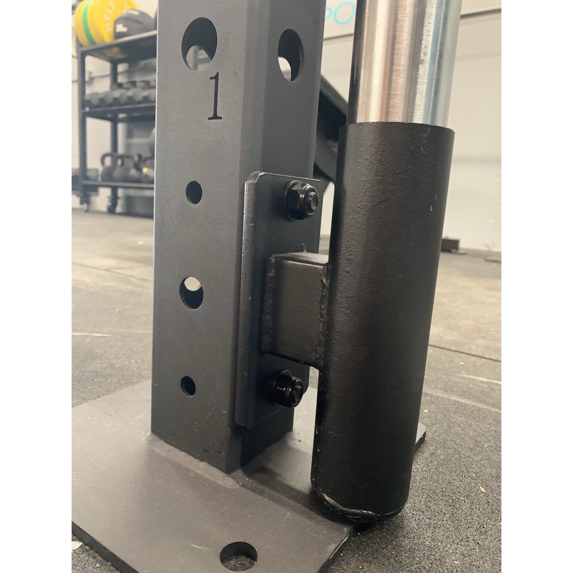 The mounting plate on this barbell storage system is uniquely designed to give you the option of a vertical mount (recommended on our rigs) or horizontal mount (for squat racks). In either instance, the Single Bar Holder should be mounted only on the exterior of the unit, and never directly under the area reserved for pull-up bar use.